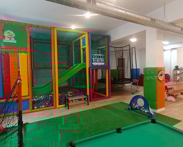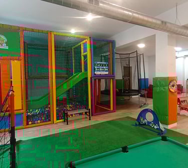 Zona infantil con juegos: piscina de bolas, cama elástica, futbolín, minibillar, etc ideal para peques llenos de energía.
