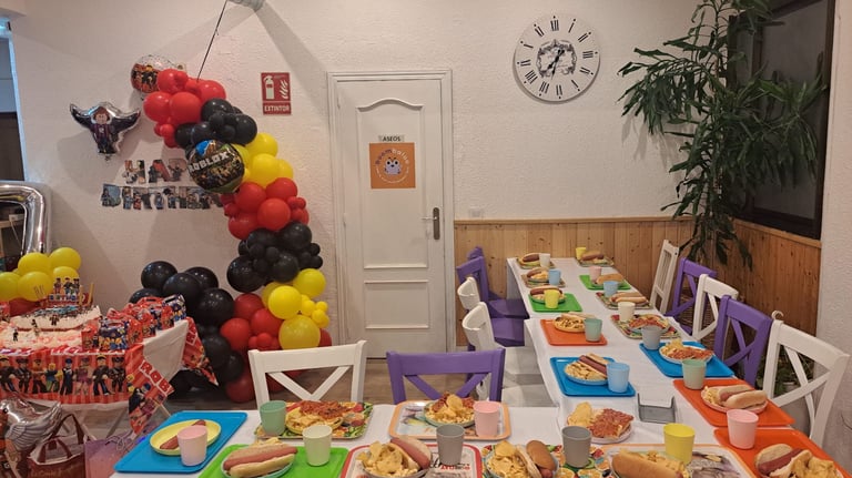 Organizamos fiestas infantiles inolvidables. 🚸 Cumpleaños Infantiles: Disfruta de un cumpleaños sin preocupaciones – nosotros nos encargamos de la diversión. El pack incluye 3 horas de sala, uso del parque de bolas, cama elástica, futbolín y zona de Ludoteca. Además, ofrecemos merienda a elegir (pizza, perrito, bebida) para cada niño. Padres y madres podéis relajaros en nuestra cafetería anexa mientras los peques juegan seguros. También celebramos fiestas de fin de curso, bautizos, comuniones...